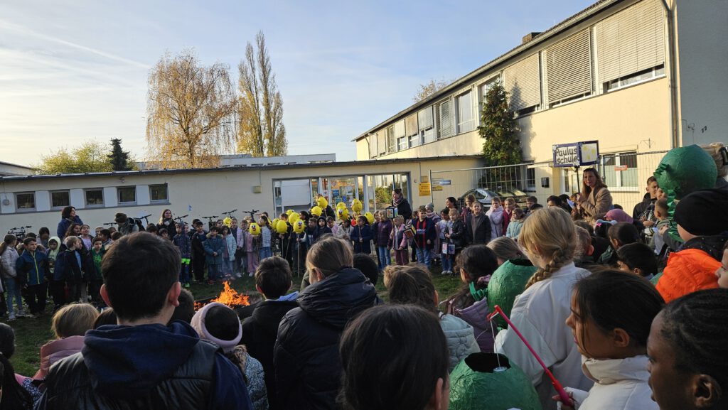 An der Paulusschule versammelte sich die Schulgemeinschaft samt der gebastelten Laternen um das Martinsfeuer und St. Martin sprach zu den Kindern, bevor schließlich noch die Weckmänner geteilt wurden.